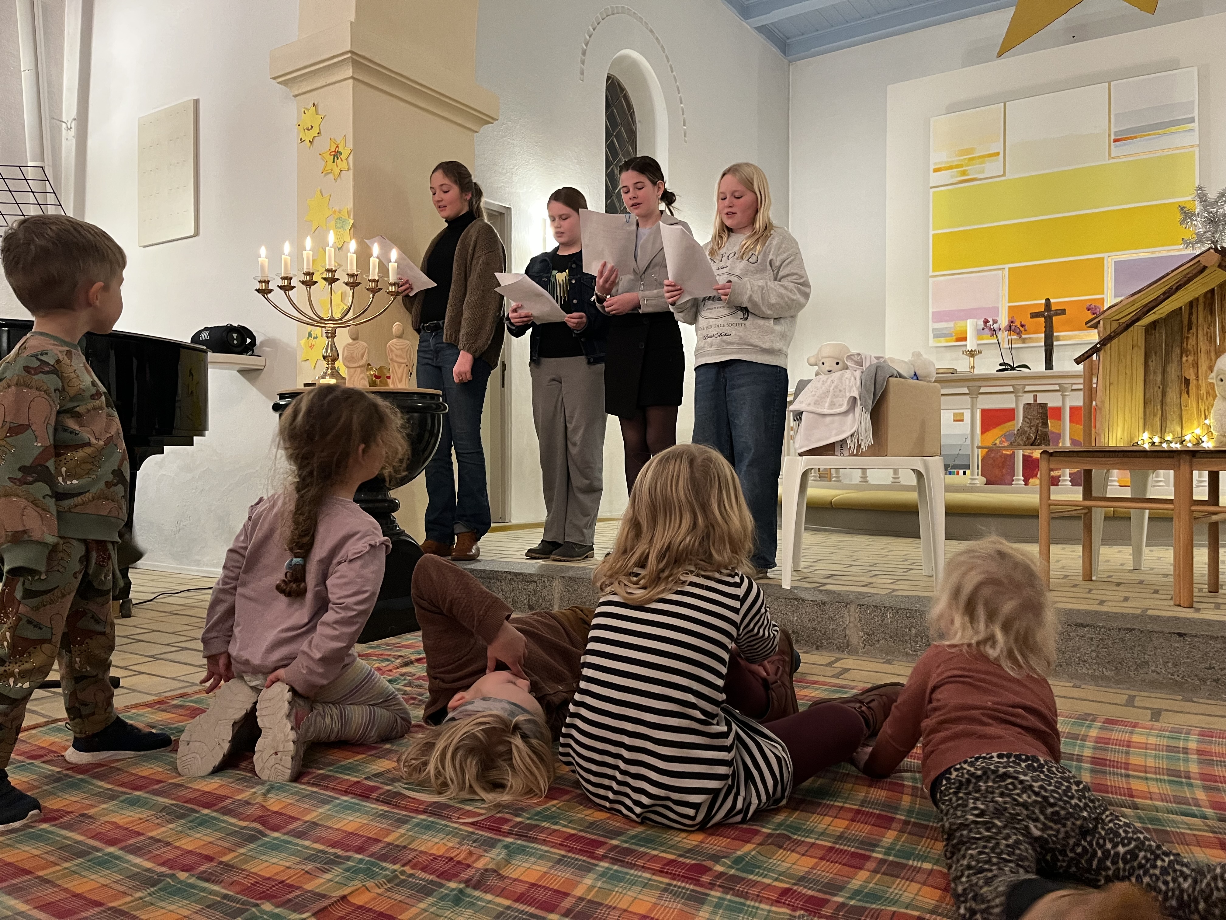 Vi begynder i kirken med fællessang og en levende bibelfortælling, som bliver fortalt på børnenes præmisser. Nogle gange er det vores minikonfirmander, Rikke og Johanne – eller en gæst udefra – der står for fortællingen.